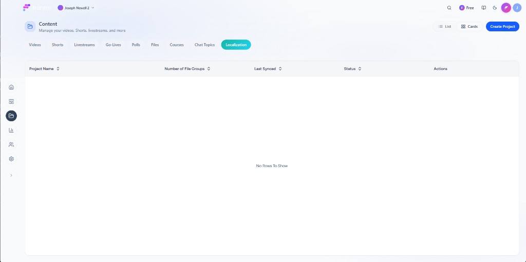 In the left navigation, go to Content, then open the Localization tab. You’ll see a table of your existing projects (if any) with columns: Project Name, Number of File Groups, Last Synced, Status, and Actions. You can switch between List and Cards view. Click Create Project to start a new project.