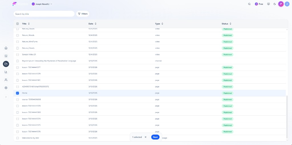 Choose which content to include. Use Search by title and Filters to find items. The table shows Title, Date, Type (e.g. video, channel, page), and Status (e.g. Published). Select one or more rows with the checkboxes, then click Next.