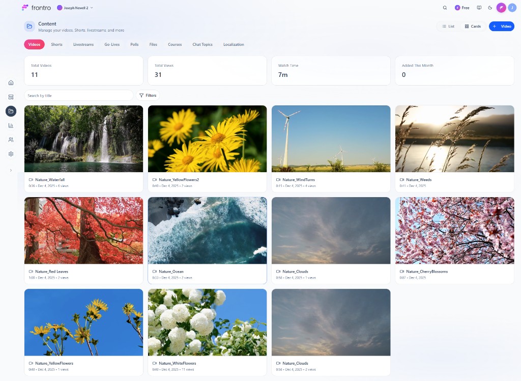 - Videos — Grid or list of videos with stats (Total Videos, Total Views, Watch Time, Added This Month). Search by title, Filters, List / Cards view, and + Video to upload.