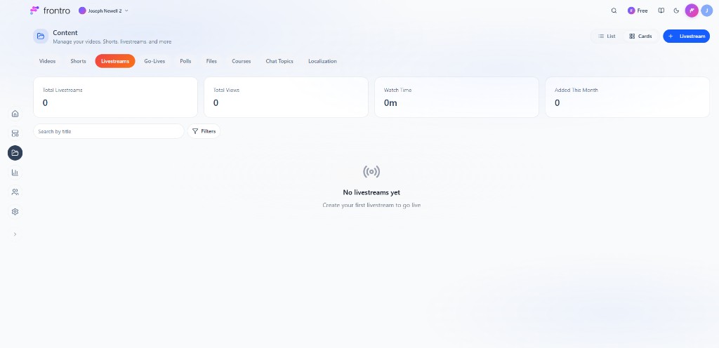 In the left navigation, open Content, then the Livestreams tab. Stats: Total Livestreams, Total Views, Watch Time, Added This Month. Use Search by title, Filters, List / Cards view, and + Livestream to create. The empty state says: “No livestreams yet. Create your first livestream to go live.”