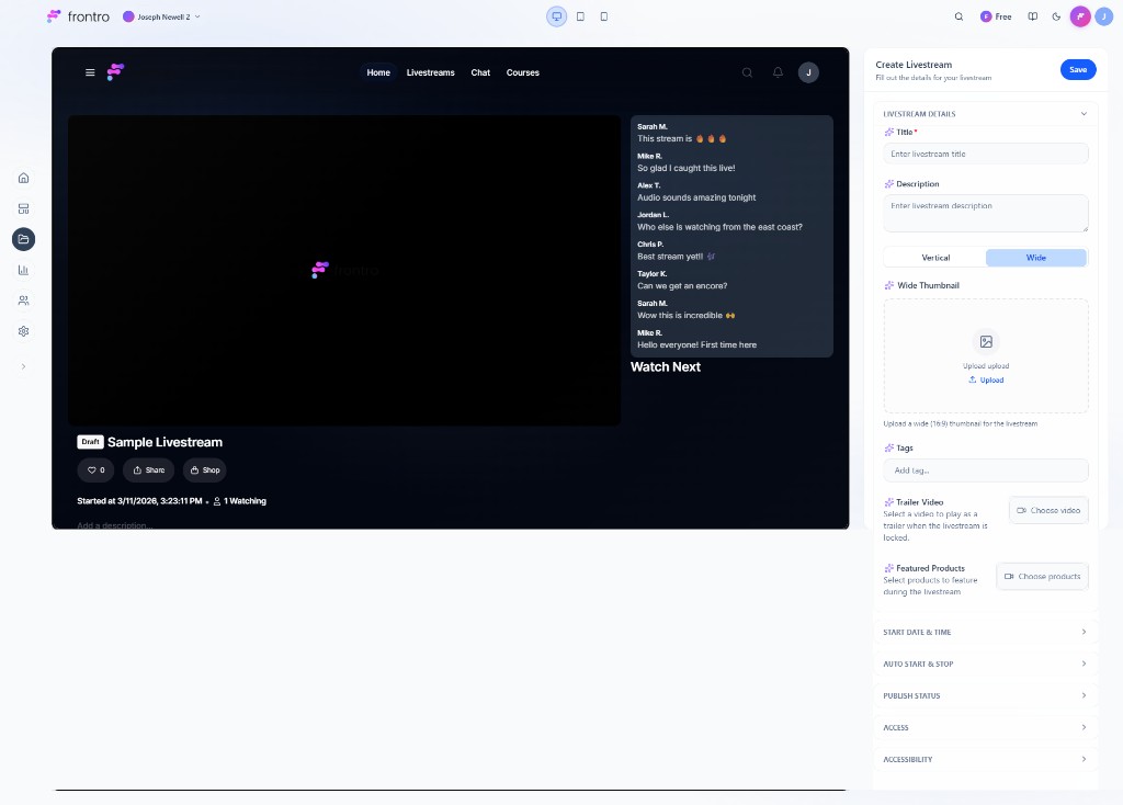 Frontro supports professional live streaming with RTMP ingest and playback across web, mobile, and TV apps. Stream using any software or hardware encoder you already trust, then manage livestreams from your channel dashboard.